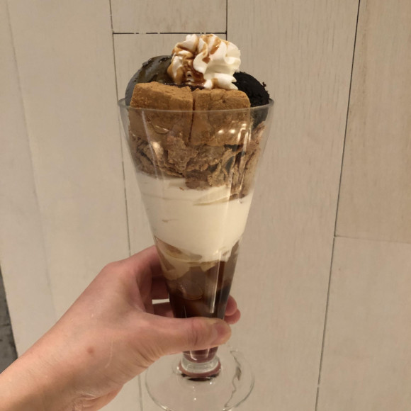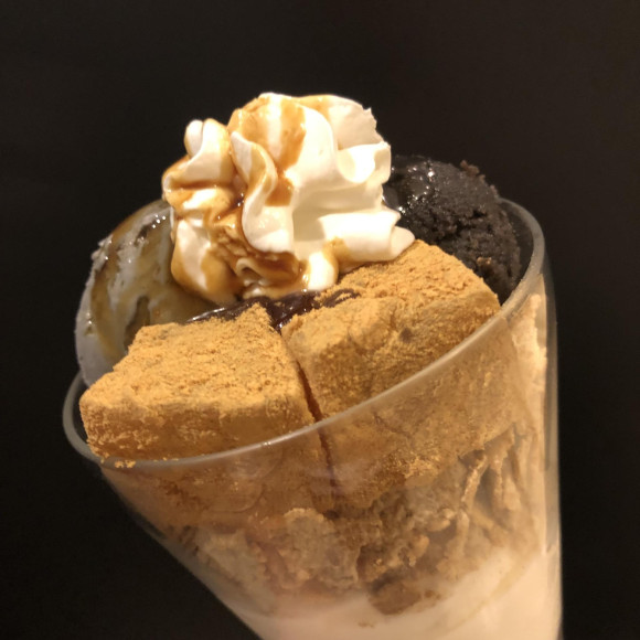 나나즈는 말차나 호지차의 이미지가 강하다고 생각합니다만, 실은 흑마 스위트나 음료도 인기가 있습니다.흑고마 파페는 아래에서 미네랄 풍부한 한천과 흑 꿀, 농후한 우유 소프트 크림에 현미 프레이크, 흑마 아이스와 흑마감 가득한 흑마안, 그리고, 버나가루를 뿌린 와라비 떡.위에는 푹신푹신 휘프 크림과 검은 꿀이 토핑되어 있고, 화를 느낄 수 있는 맛있는 파페입니다.
